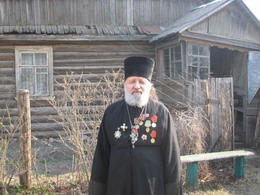 Рядом стоит старый бревенчатый дом священника отца Александра, батюшка выходит на крыльцо, и мы так на нем устраиваемся для разговора. С протоиреем Александром Ивановичем Михайловым мы уже встречались и публиковали интервью с ним, но батюшке оно не понравилось. Говорит, написали, что пулемет на голове нес, а нес на плечах…
