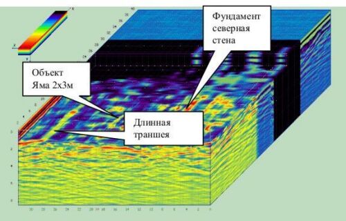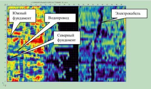 3. Вдоль всего правого придела внутри фундамента на одной оси (помимо указанной ямы) имеются еще два аналогичных прямоугольных объекта меньшей площади. Предполагаем, что это места захоронения митрополита Иннокентия (Фигуровского) и архиепископа Симона (Виноградова) — начальников XVIII и XIX РДМК, соответственно.